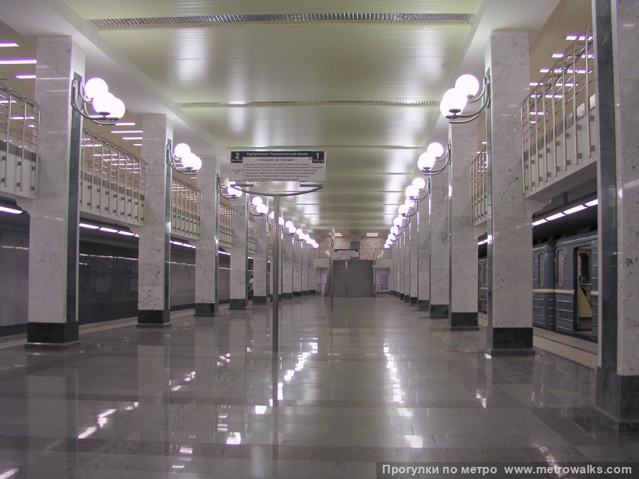 Путевые стены станции облицованы белым мрамором «коелга» и серым гранитом «возрождение» в виде чередующихся участков. Колонны облицованы белым мрамором с вертикальными полосами и цоколями из зелёного мрамора. Пол выложен серым гранитом с красными контурными квадратами и узкими белыми полосами вдоль края платформы.