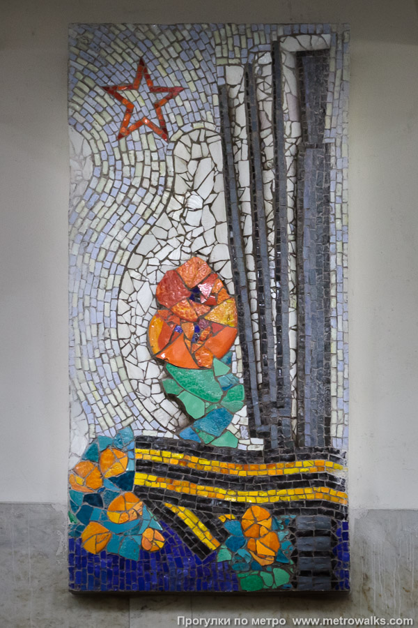 - Путевую стену украшают двадцать четыре небольшие мозаики, посвящённые Крыму, Чёрному морю и Черноморскому флоту, воинской памяти. Мозаика № 1 «Крейсер».