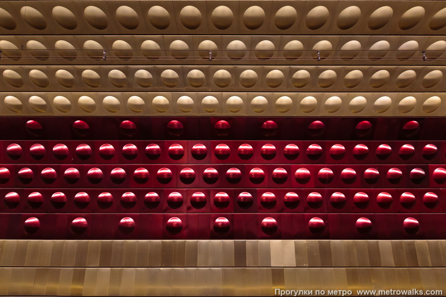 Станция относится ко второму пусковому участку линии «A», построена на два года позже первой очереди по классическому проекту пилонных станций глубокого заложения с широкими пилонами; художественное оформление станции выполнено в унифицированном стиле с соседними станциями линии. Путевые стены облицованы анодированными алюминиевыми пластинами разных цветов со штампованными утопленными кругами. Основной цвет облицовочных пластин на всей линии — желтовато-“шампанский”; индивидуальный цвет пластин этой станции — красно-бордовый.